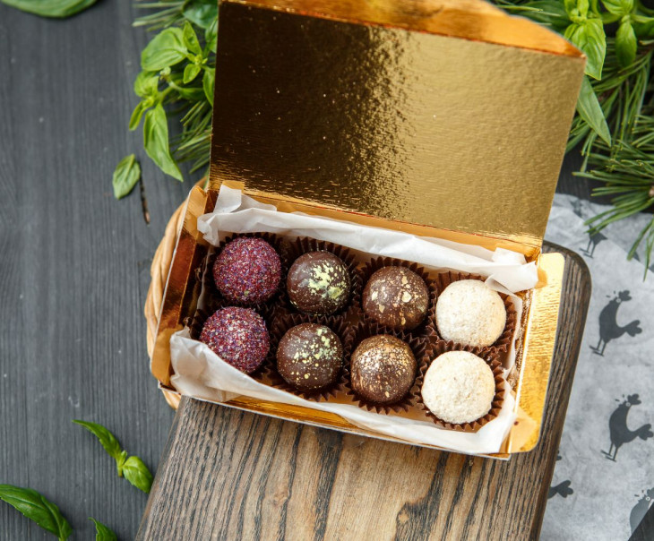 Описание: Конфеты ручной работы удивят самых искушённых гурманов и помогут расширить Ваши гастрономические горизонты. В наборе Вас ждут 4 впечатляющих вкуса: «Глинтвейн» – вкус фруктов, специй, шоколада и выдержанного сыра (не содержит алкоголь); «Парика» – зимнее сочетание вкусов и ароматов пяти специй, бельгийского шоколада, сливок и сыра, переплетённые в едином ансамбле; «Халва» – сочетания вкуса халвы, бельгийского шоколада, орехов и сыра; «Лимон» – тёмный бельгийский шоколад с кислинкой спелого лимона и пармезана. В производстве наших конфет мы используем только натуральные ингредиенты, без ароматизаторов, усилителей вкуса и консервантов.