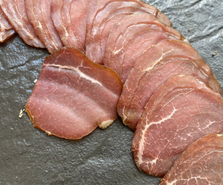 Описание: Ароматная сыровяленая говядина с богатым букетом пряностей и легкой кислинкой гранатового экстракта. Идеальна в качестве закуски к вину или сырной тарелке.