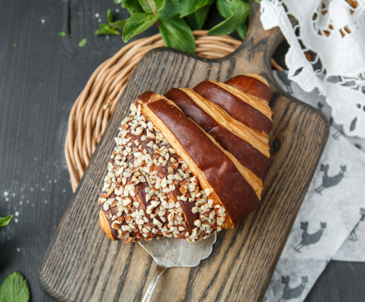 Описание: Изумительно воздушный и нежный круассан из слоеного теста с начинкой из шоколадно-орехового пралине. Лакомство идеально подойдет как для самостоятельного перекуса, так и в качестве дополнения к завтраку или ланчу. Свежий круассан станет ярким акцентом на вашем столе и украсит собой чайную паузу. Выпечка готовится по особой рецептуре с использованием исключительно свежих и натуральных ингредиентов.