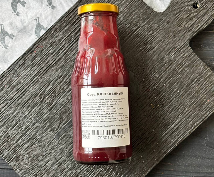 Описание: Клюквенный соус - это кисло-сладкая заправка отлично подходящая для мясных и кондитерских (!!!) блюд, а также для сыра. Особенно удачно он сочетается с запеченными индейкой, уткой, гусем, олениной, фазаном, говядиной, свининой, курицей, бараниной (ягнятиной). Также этот соус хорошо подавать к различным мясным паштетам и галантинам. Клюквенный соус отлично подходит к творогам и сырникам, а также к мясным и сладким пирогам, а шарлотка с этим соусом просто «космос» ! Этот соус придаст блюдам уникальный, яркий и праздничный вкус.