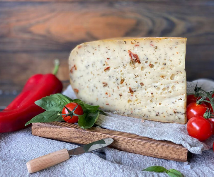Описание: Гауда три специи - это классическая Гауда с добавлением томата, базилика и паприки. Очень ароматное сочетание нежно-сливочной Гауды с яркими итальянскими спутниками! Сыр станет идеальным компаньоном для пасты и пиццы! Для омлетов и пирогов! Да и просто станет особенным соседом на вашей сырной тарелке.